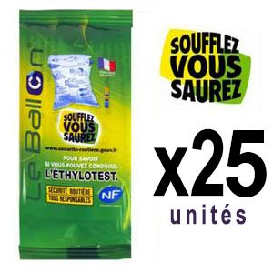 La description : Lot de 25 Ethylotests chimiques à usage unique certifié NF. Depuis le 1 janvier 2012 tout conducteur doit passéder dans sa voiture 2 ethylotests. Mode d'emploi Sortez le tube test du ballon Pressez le tube test pour faire disparaitre les pointillés Gonflez le ballon en une seule fois. Placez le tube test (embout bleu) sur l'embout bleu du ballon. Dégonflez le ballon Les cristaux jaune passent au vert si vous avez consommé de l'alcool. Dans le cas ou les cristaux vert dépassent la ligne noir sur le tube test vous ne pouvez pas conduire sans être en infraction.