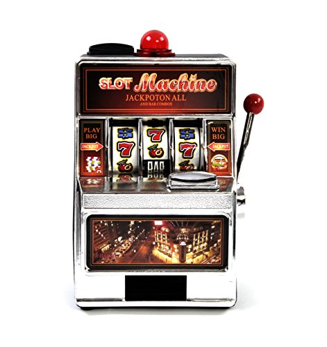 La description : Hucha Máquina Tragaperras. Divertida hucha tragaperras, si se introducen las monedas por la parte superior hace la función de hucha, pero si se introducen las monedas por la parte frontal hay que seguir jugando y tirando de la palanca hasta que salgan en línea, se encenderá la luz roja que hay en la parte superior, sonará la música de premio y devolverá todas las monedas que tiene dentro. Funciona con Pilas. No incluidas. Medidas 19 x 13.5 cm. Aprovecha esta Oferta y ahorra jugando a las tragaperras.