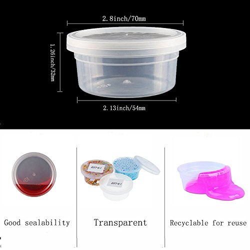 - 【24Packs & Perfect Size】: Calibre supérieur 2.8inch / 70mm, calibre inférieur 2.13inch / 54mm, hauteur 1.26inch / 30mm; Chaque boîte peut contenir 30 grammes d'argile, 24 conteneurs de stockage Slime Enough, vous pouvez distribuer votre propre argile comme vous le souhaitez. vraiment pratique pour classer vos différentes couleurs de boules de mousse visqueuse.