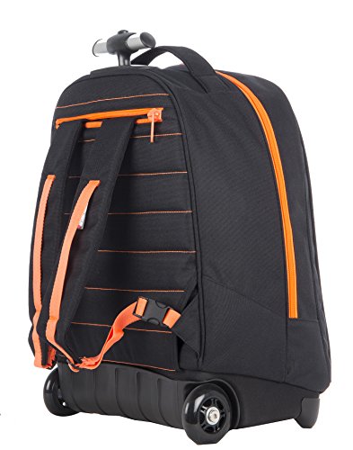 - TROLLEY: Barre télescopique avec deux positionnements. Roues 75 mm. Fond rigide et renforcé avec protection. Bretelles escamotable dans la poche arrière.